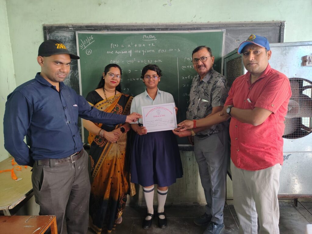 विद्यालय प्रशासन द्वारा उनकी रचनात्मक प्रतिभा और उत्कृष्ट उपलब्धि को सम्मानित करते हुए “Certificate of Merit” प्रदान किया गया। इस अवसर पर विद्यालय के प्रधानाचार्य सीपी तिवारीअध्यापक दुर्गेश संदीप अध्यापिका सुब्रा मैडम ने सर्टिफिकेट ऑफ़ मेरिट प्रदान करछात्र छात्राओं के उज्ज्वल भविष्य की कामना करते हुए कहा कि इस प्रकार की गतिविधियाँ बच्चों में आत्मविश्वास, सृजनात्मकता और प्रतिस्पर्धा की भावना को बढ़ावा देती हैं।