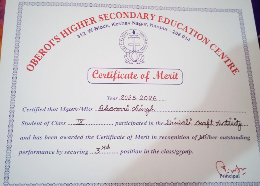 ओबराय हायर सेकेंडरी एजुकेशन सेंटर, केशव नगर की कक्षा 9वीं की छात्रा कु. भूमि सिंह ने शैक्षणिक सत्र 2025–2026 में आयोजित दीवाली क्राफ्ट गतिविधि में उत्कृष्ट प्रदर्शन करते हुए तृतीय स्थान प्राप्त कर विद्यालय, शिक्षकों और अपने परिवार का नाम गौरवान्वित किया है।