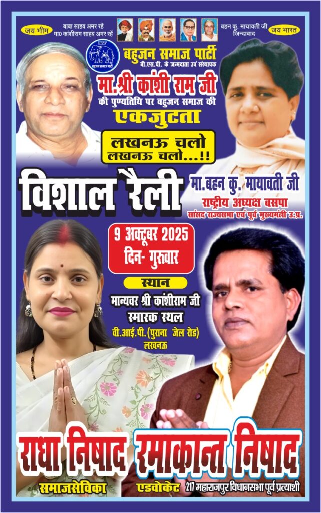 हुंकार भरे समाज सेवी रमाकांत राधा निषाद – लखनऊ चलो, बहुजन एकता दिखाओ! कानपुर।बहुजन समाज पार्टी (बीएसपी) संस्थापक मान्यवर कांशीराम जी की पुण्यतिथि के अवसर पर आयोजित “बहुजन एकजुटता महा रैली” को ऐतिहासिक बनाने के लिए कानपुर में तैयारियाँ जोरों पर हैं। बीएसपी के वरिष्ठ नेतानगर अध्यक्ष रामनारायण निषाद के मार्गदर्शन पर  महाराजपुर विधानसभा के